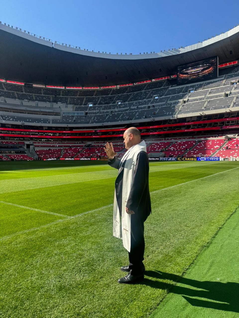 Durante la visita, monseñor Acero bendijo con agua bendita el campo de juego, entre otras áreas del Estadio Banorte, y también oró por los trabajadores que participaron en la construcción, quienes se acercaron para recibir su bendición.