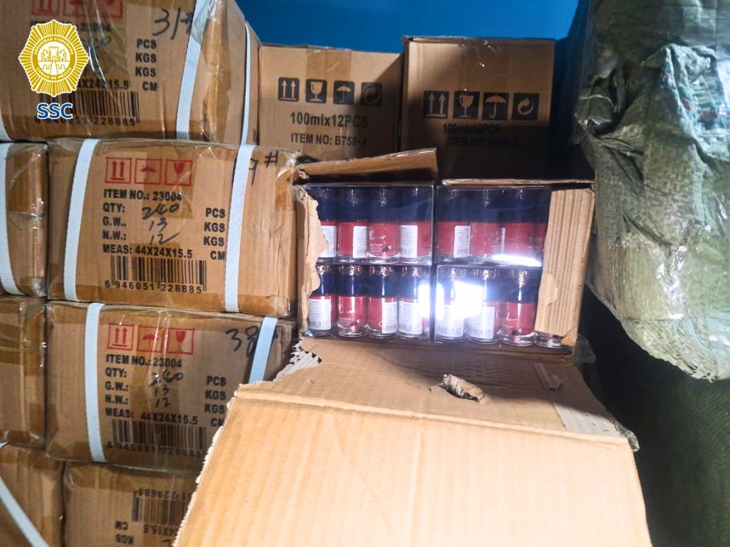El aseguramiento de la mercancía extranjera incluyó perfumes, cosméticos, barnices y mercancía diversa, además de dos camionetas y una caja seca, cuyos operadores no acreditaron la procedencia legal de los productos.