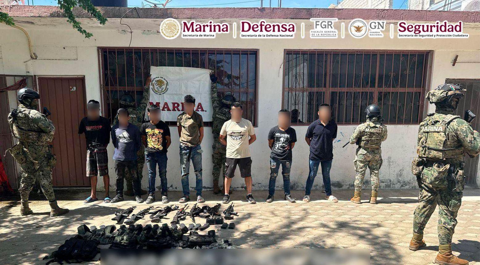 Elementos de la Secretaría de Marina (Semar) a través de la Armada de México, detuvieron en Coyuca de Benítez, Guerrero, a siete generadores de violencia, a quienes aseguraron armas de fuego, equipo táctico, droga y vehículos.