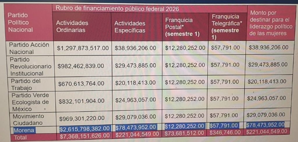 En año no electoral, el financiamiento público para los partidos políticos nacionales en 2026 asciende a 7 mil 737 millones 252 mil 697 pesos, avaló el Consejo General del Instituto Nacional Electoral (INE).