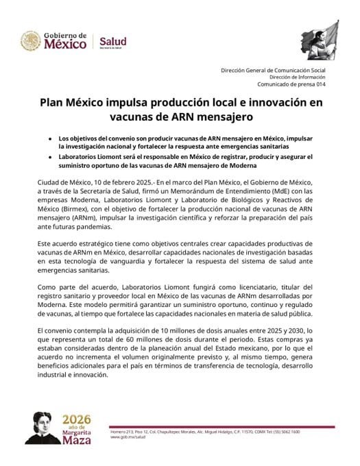 Otro punto importante es la transferencia de tecnología y planta de producción. Uno de los aspectos más estratégicos es el plan escalonado para instalar una planta de vacunas ARNm en México, con transferencia de tecnología de Moderna a Liomont.