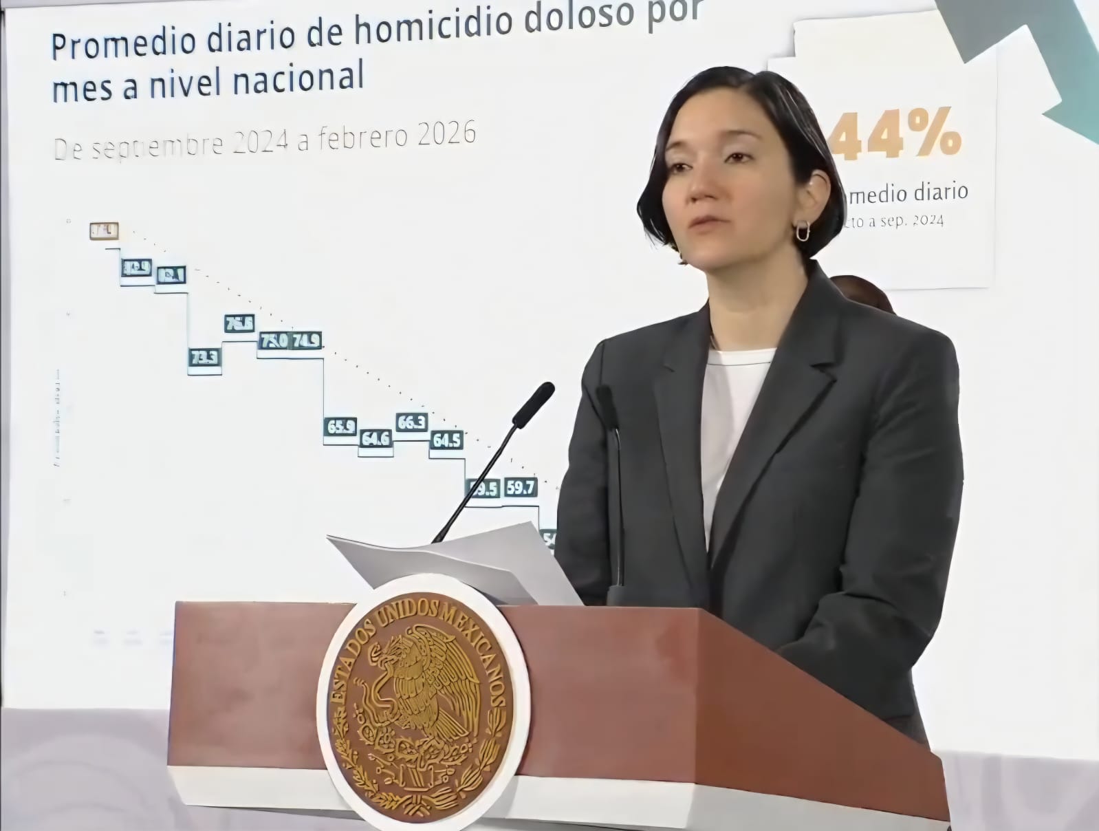 Al presentar el informe de incidencia delictiva con cifras consolidadas a febrero de 2026, la funcionaria señaló que al inicio de la actual administración se registraban 86.9 homicidios diarios, mientras que el mes pasado el promedio fue de 48.8 casos por día.