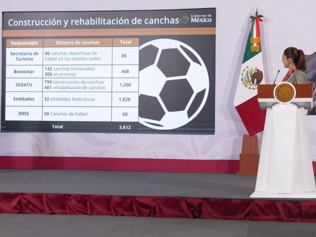 Rodríguez Velázquez detalló que distintas instituciones participan en la meta global: la Secretaría de Turismo contempla 86 espacios, la Secretaría de Bienestar 448, el sector salud suma mil 200 canchas construidas o rehabilitadas, y el Instituto Mexicano del Seguro Social prevé la construcción de 50 nuevas canchas de futbol.