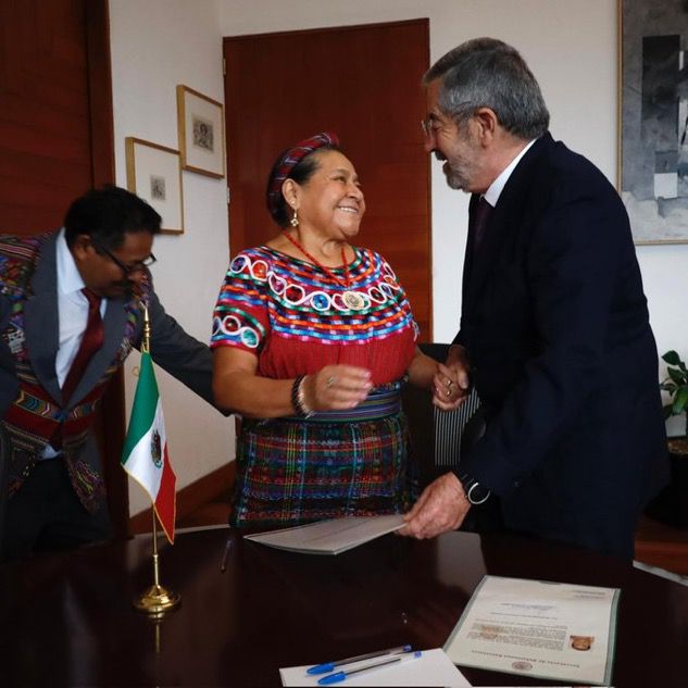 En sus redes sociales, la SRE, destaco que en la sede de la SRE, el canciller Juan Ramón de la Fuente recibió, a nombre de la presidenta Claudia Sheinbaum Pardo a Rigoberta Menchú, Premio Nobel de la Paz 1992, a quien entregó su carta de naturalización la cual la acredita como mexicana.