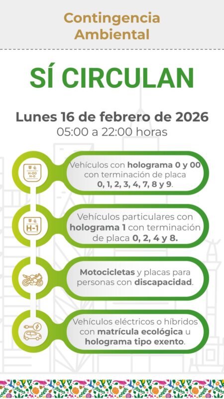 Debido a ello, para este lunes 16 de febrero deberán suspender su circulación, en horario de las 5:00 a las 22:00 horas, los vehículos de uso particular con holograma de verificación 2.