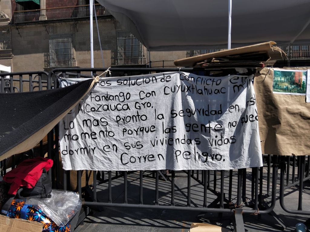 En las mantas instaladas frente a Palacio Nacional se lee: “Queremos solución de conflicto en Cruz Fandango con Cuyuxtlahuac municipio de Alcozauca Gro. Lo más pronto la seguridad en el momento porque la gente no puede dormir en sus viviendas. Vidas corren peligro.”