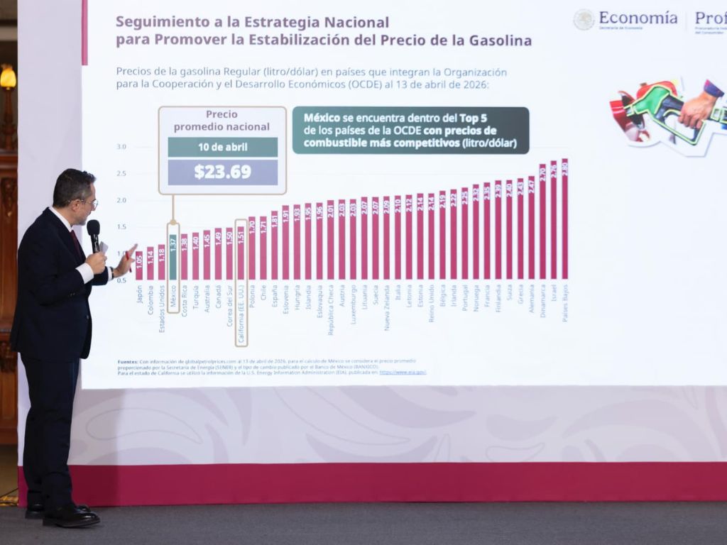 Respecto a los combustibles, informó que el litro de gasolina regular tiene un precio promedio nacional de 23.69 pesos y destacó que, en comparación con otras economías, México se encuentra entre los países con menor costo.