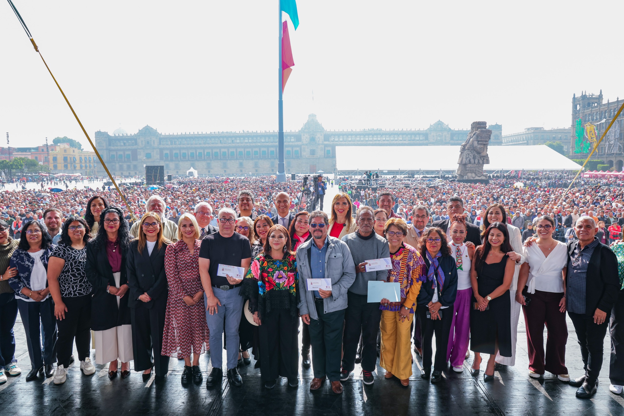 28-agosto-2025.- En el Zócalo, la jefa de Gobierno, Clara Brugada, hizo última entrega del programa Hombres Bienestar de 60 a 64 años. AMEXI/ Foto: Gob. de CDMX.