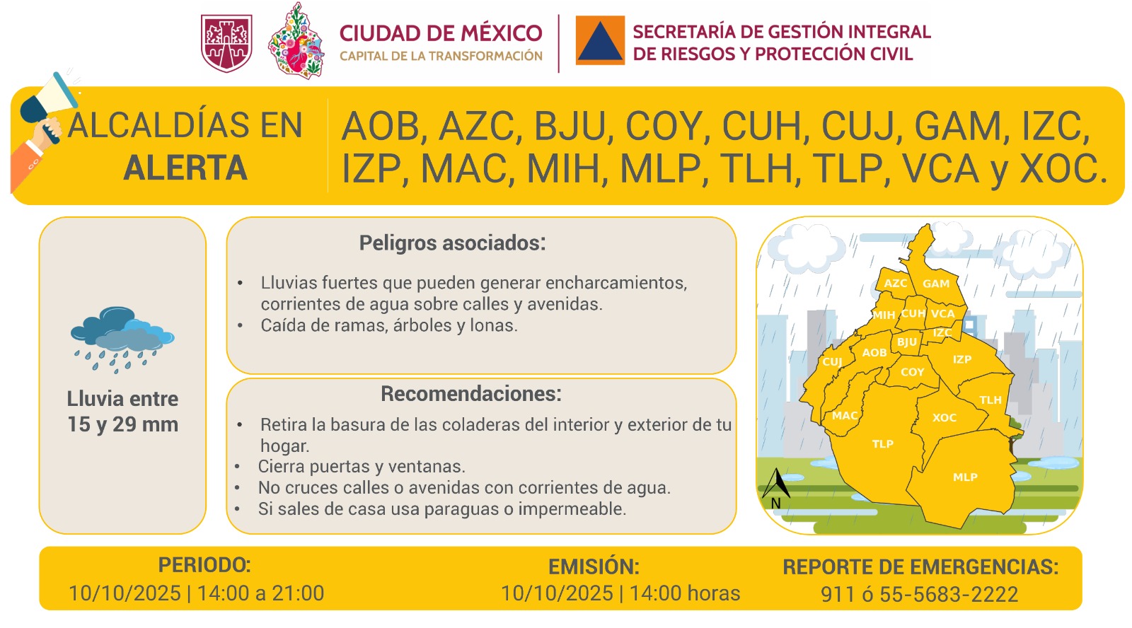 La Secretaría de Gestión Integral de Riesgos y Protección Civil activó la Alerta Amarilla y recomendó a los capitalinos portar paraguas este viernes por pronósticos de fuertes lluvias en todas las demarcaciones, ya que se prevén lluvias en la CDMX de entre 15 y 29 milímetros alrededor de las 14:00 y las 21:00 horas de este viernes 10 de octubre.