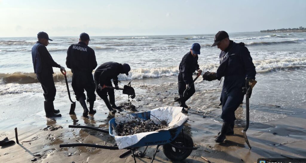 Personal de las secretarías de Marina (Semar) y de Medio Ambiente y Recursos Naturales (Semarnat), así como de Petróleos Mexicanos (Pemex) recogen manualmente los residuos e instalaron barreras de contención para evitar la dispersión del crudo hacia ecosistemas sensibles.