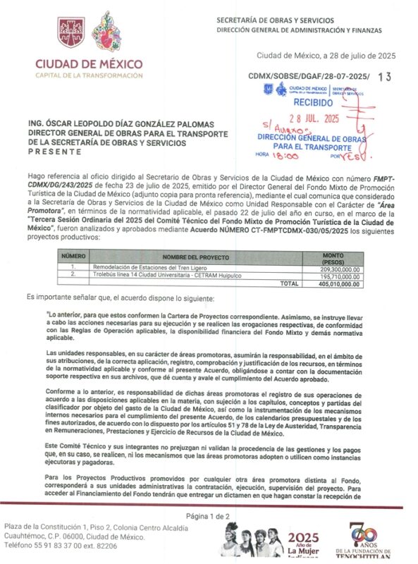 El oficio CDMX/SOBSE/DGAF/28-07-2025/13, fechado el 28 de julio de 2025, confirma que el Comité Técnico del Fondo Mixto de Promoción Turística aprobó el acuerdo CT-FMPTCDMX-030/05/2025, asignando una partida presupuestal específica: