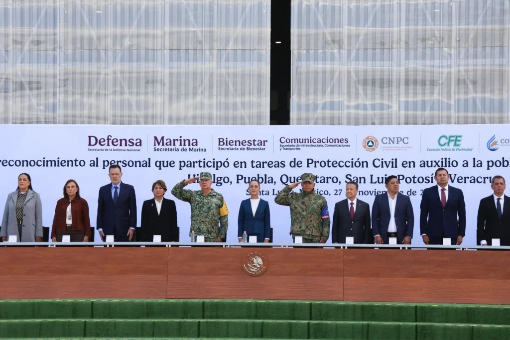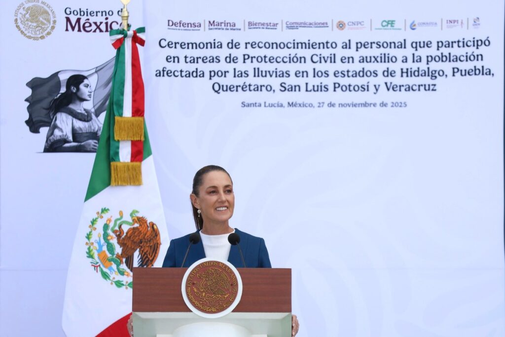 En Zumpango, Estado de México, la presidenta Claudia Sheinbaum Pardo encabezó un homenaje al personal civil y militar que participó en la atención de las lluvias extraordinarias que afectaron en octubre pasado a Hidalgo, Puebla, San Luis Potosí, Querétaro y Veracruz.