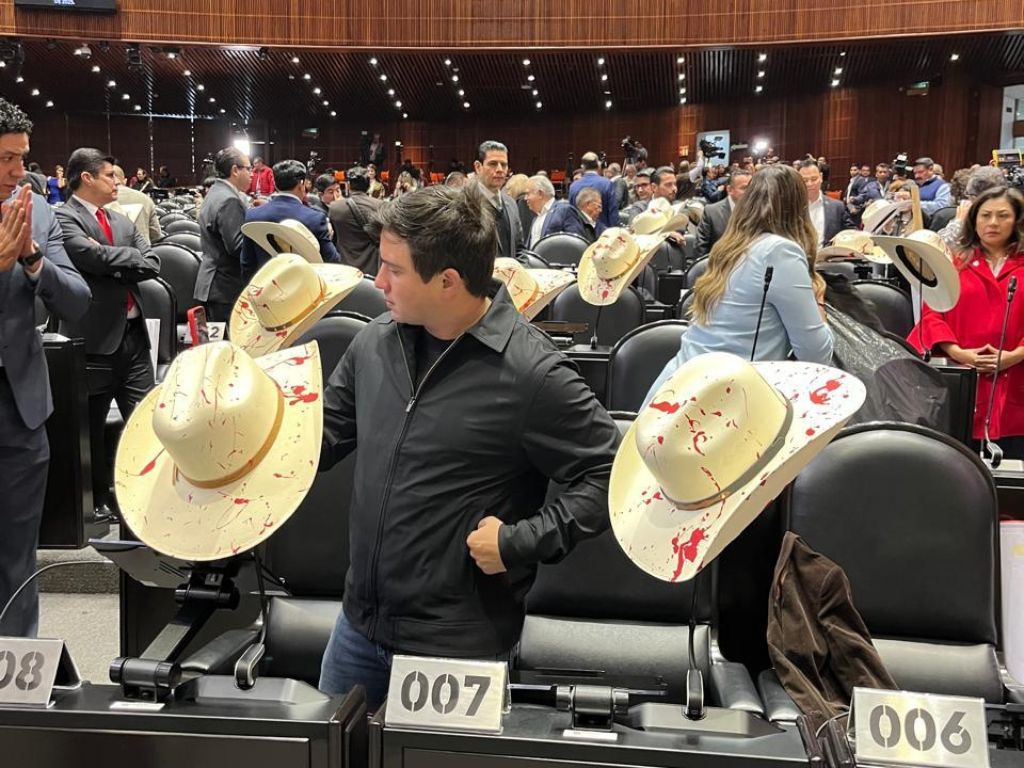 México, 4 de noviembre del 2025. Sombreros con pintas rojas en curules priistas exigen justicia por el asesinato del alcalde de Uruapan, Carlos Manzo. AMEXI/Foto/Maribel Islas.