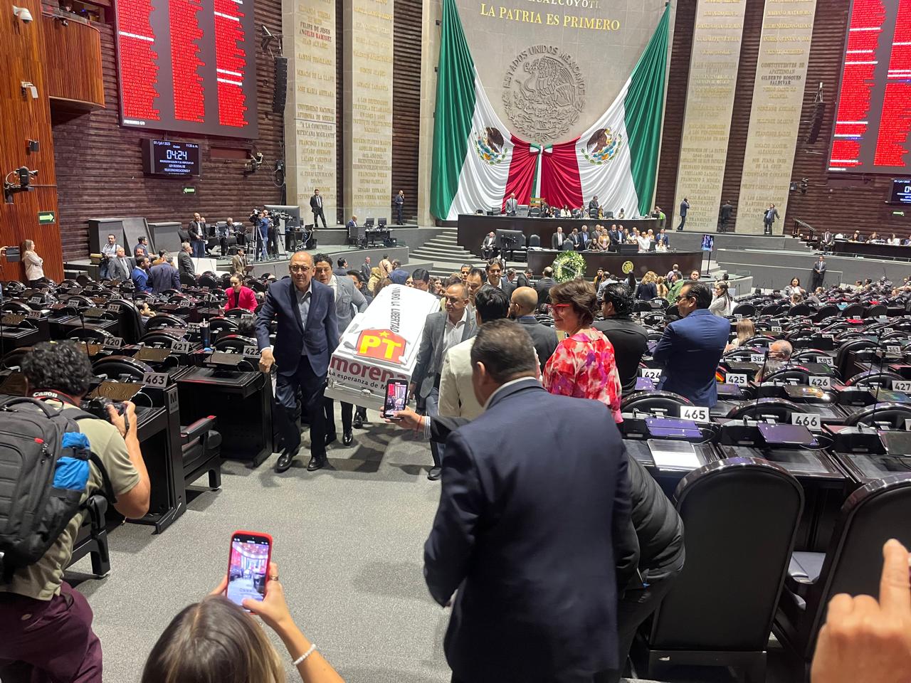 La legisladora priista Laura Ivonne Ruíz Moreno subió a la tribuna acompañada de legisladoras y legisladores de su partido con cinta plateada en la boca y cartulinas en las que se podía leer: