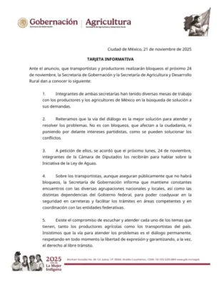 La Secretaría de Gobernación (Segob) y la Secretaría de Agricultura y Desarrollo Rural emitieron el viernes 21 de noviembre una tarjeta informativa conjunta en la que reiteraron la disposición del gobierno a abrir mesas de diálogo con representantes de transportistas y productores del campo.